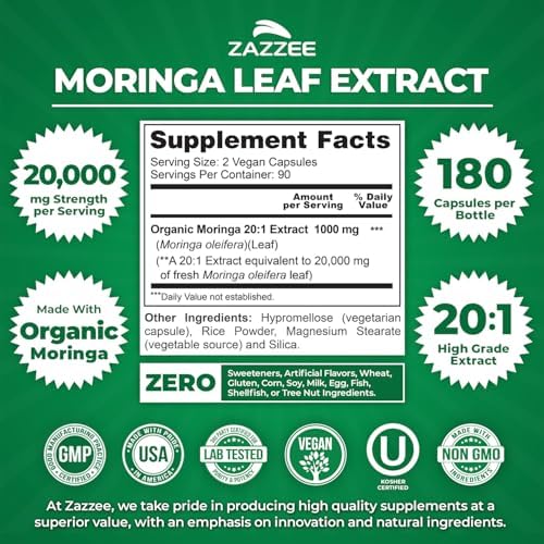 Zazzee Organic Moringa 20:1 Extract, 20,000 mg Strength, 180 Vegan Capsules, 100% Pure Oleifera Leaf Superfood, Concentrated and Standardized 20X Extract, All-Natural, Non-GMO, Made in The USA